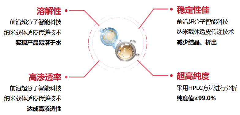 美白原料功效显著,但无法避免其水溶性差、稳定性差、生物利用率低等副作用,梅奥华卫科研团队针对传统美白原料应用痛点,展开深入研究与技术攻关,通过超分子包合技术(诺贝尔化学奖研究成果)及纳米载体透皮传递技术,解决传统化学难以实现的稳定性、靶向性与安全性问题,助力美白进阶,实现强渗稳效。同时,本系列产品不含光甘草酚及其他黄酮类结构类似物等杂质,敏感肌使用产品更安全。该系列产品凭借其独特的技术、卓越的功效和良好的市场反馈,赢得了专家评审团和广大消费者的一致认可。
