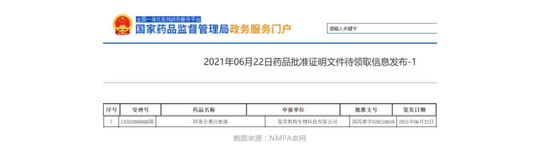 [1]2021年06月22日药品批准证明文件待领取信息发布-1 . Retrieved Jun 22,2021, from https://www.nmpa.gov.cn/zwfw/sdxx/sdxxyp/yppjfb/20210622215839168.html[2]复星凯特益基利仑赛注射液新药上市申请获国家药品监督管理局正式受理. Retrieved Feb 24,2020, from http://www.fosunkitebio.com/news/details-4079.html[3]复星凯特官网. Retrieved Jul 24,2020, from http://www.fosunkitebio.com/about.html[4]2020 ASH | Yescarta®一线治疗高危大B细胞淋巴瘤中期研究数据发布. Retrieved Dec 7,2020, from https://mp.weixin.qq.com/s/ip0c3NwyA7mLjRWymv8a2w